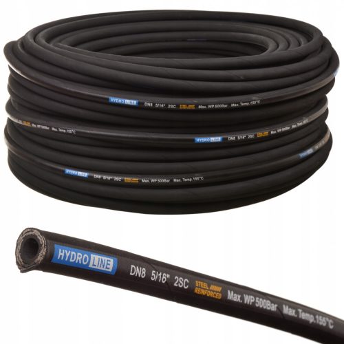 DN8, 5/16" HydroLine magasnyomású hidraulikus tömlő, 500 bar nyomásállósággal, dupla acélfonatos erősítéssel. Professzionális magasnyomású mosókhoz és hidraulikus alkalmazásokhoz. A tömlő méterre vásárolható.