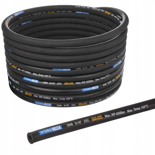 DN8, 5/16" HydroLine magasnyomású hidraulikus tömlő, 400 bar nyomásállósággal, dupla acélfonatos erősítéssel. Professzionális magasnyomású mosókhoz és hidraulikus alkalmazásokhoz. A tömlő méterre vásárolható.