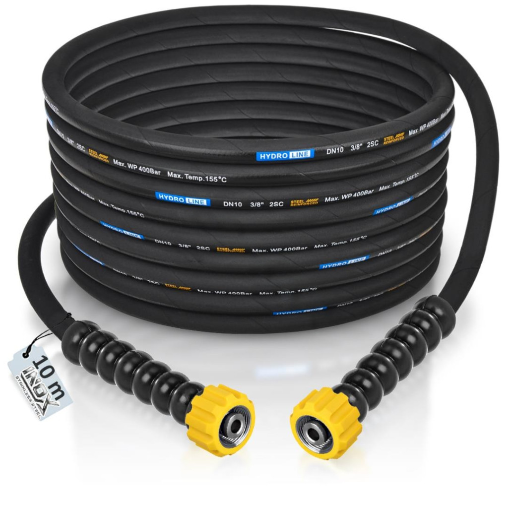 A HydroLine DN10 2SC 10 méteres, 400 bar maximális nyomásra tervezett magasnyomású tömlő ideális választás hideg- és melegvizes ipari mosókhoz, különösen nagy vízszállítású (kb. 1200 l/h feletti) berendezésekhez. A tömlő 10 mm belső átmérőjű, M22x1,5 – M22x1,5 INOX csatlakozásokkal szerelt, így kiválóan használható számos KARCHER HD / HDS és KRANZLE magasnyomású mosóval.