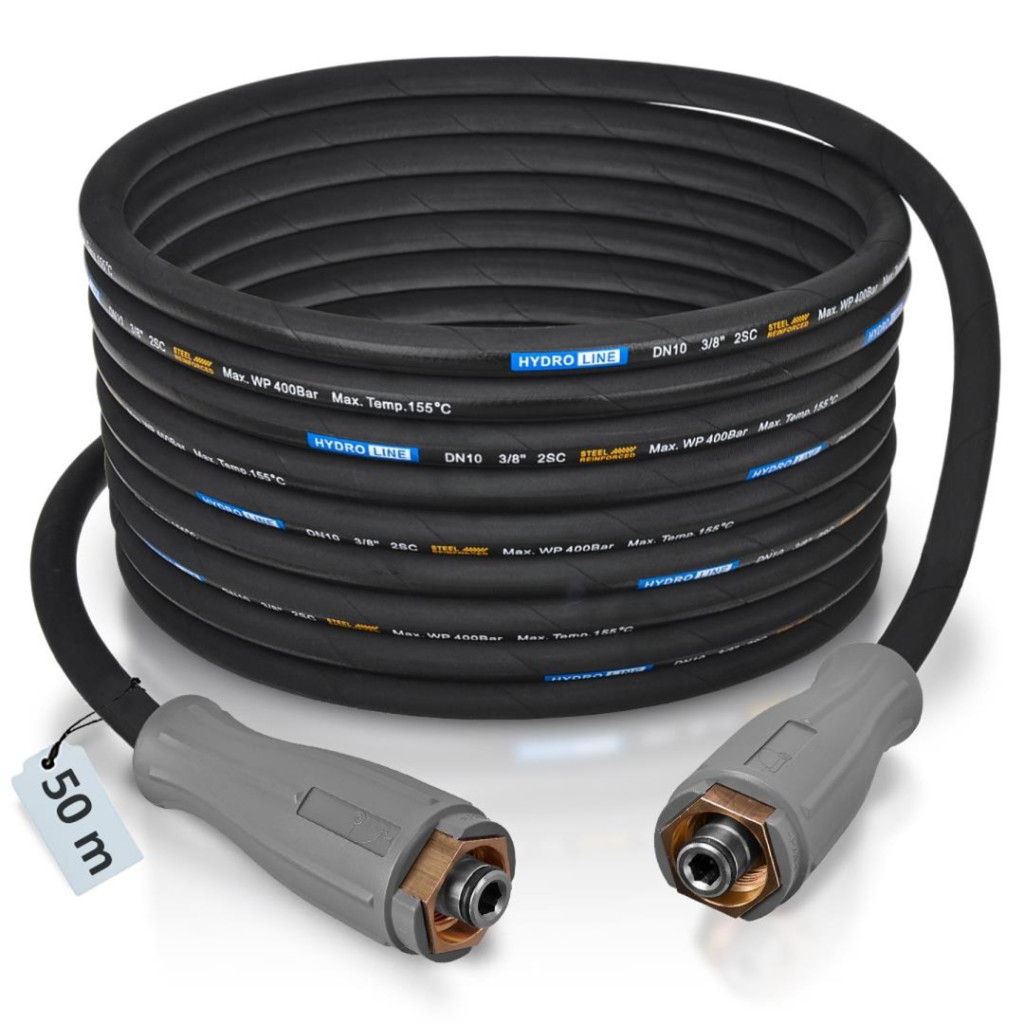 HOSSZÚ TÖMLŐIPARI FELHASZNÁLÁSRA: 50 m HydroLine DN10 2SC magasnyomású tömlő nagy munkaterülethez; ideális ipari, autómosó és szerviz környezetben