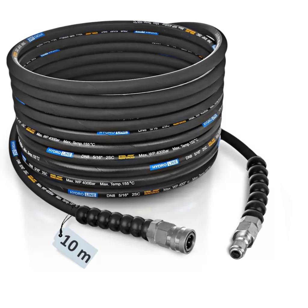 Hydroline magasnyomású tömlő Nilfisk / WAP / Ehrle típusokhoz 10m DN8 400 bar professzionális ipari felhasználásra szánt, extra erősítésű cseredarab. Masszív, dupla acélszövetes (2SN) kialakításának köszönhetően extrém igénybevétel mellett is megállja a helyét.