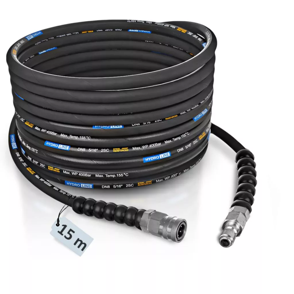 Hydroline magasnyomású tömlő Nilfisk / WAP / Ehrle típusokhoz 15m DN8 400 bar professzionális ipari felhasználásra szánt, extra erősítésű cseredarab. Masszív, dupla acélszövetes (2SN) kialakításának köszönhetően extrém igénybevétel mellett is megállja a helyét.