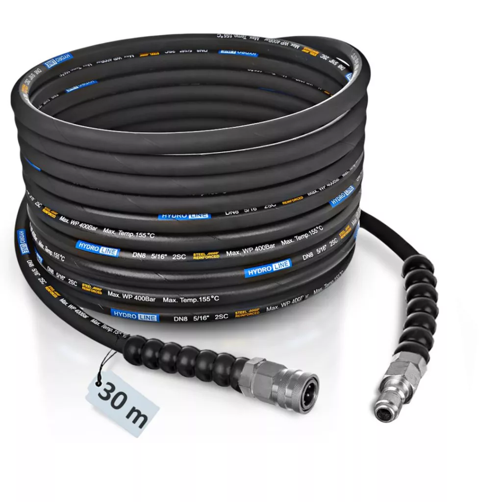 Hydroline magasnyomású tömlő Nilfisk / WAP / Ehrle típusokhoz 30m DN8 400 bar professzionális ipari felhasználásra szánt, rendkívüli hatótávolságot biztosító cseredarab. Masszív, dupla acélszövetes (2SN) kialakítása garantálja a tartósságot ekkora hossz mellett is.