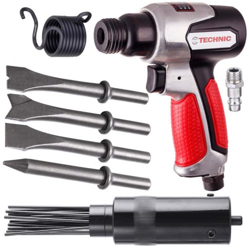 Sokoldalú, pneumatikus tűs- és vésőkalapács rövid kivitelben, amely ideális különféle autószerelő, karosszérialakatos és ipari karbantartási feladatokhoz. A készletben található 4 különböző véső, valamint egy tűs fej, amely hatékonyan segít a rozsda, festék, salak és egyéb szennyeződések eltávolításában fémfelületekről.