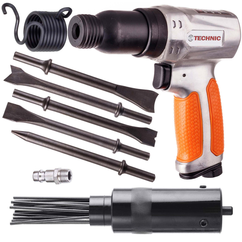 Műhelyminőségű pneumatikus tűs vésőkalapács készlet – tűs fej + 5 db vágó- és vésőszár, sűrített levegős ütvekalapács rendszerrel