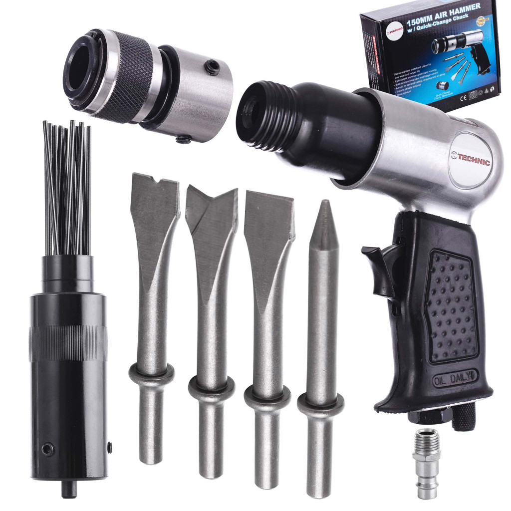 Professzionális pneumatikus tűkalapács automata működéssel, komplett tartozékkészlettel. Ideális fémfelületek tisztítására, sorjátlanítására, rozsdamentesítésre, illetve bontási és vésési munkákhoz. A szerszámhoz tűs fej és 4 darab különböző vésőszár tartozik, így sokoldalúan használható műhelyben, ipari környezetben és karbantartási feladatoknál.
