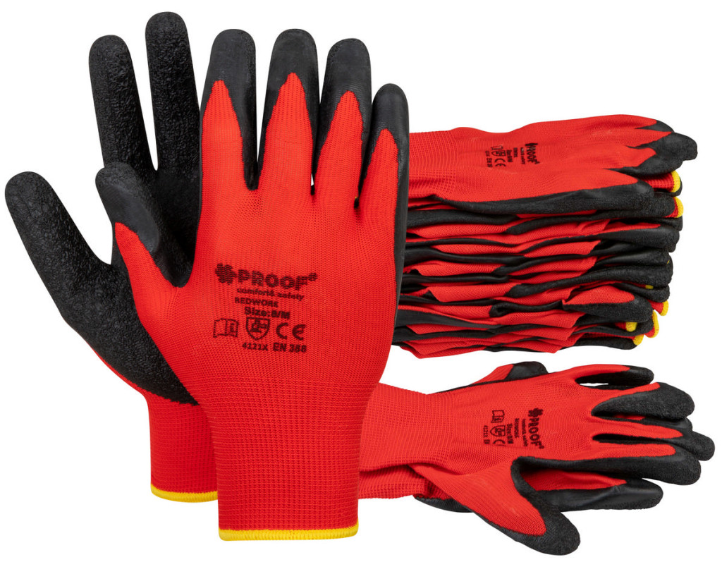 REDWORK Klasszikus Piros Poliészter Kesztyűk Fekete Durva Latex Bevonattal, 12 Pár