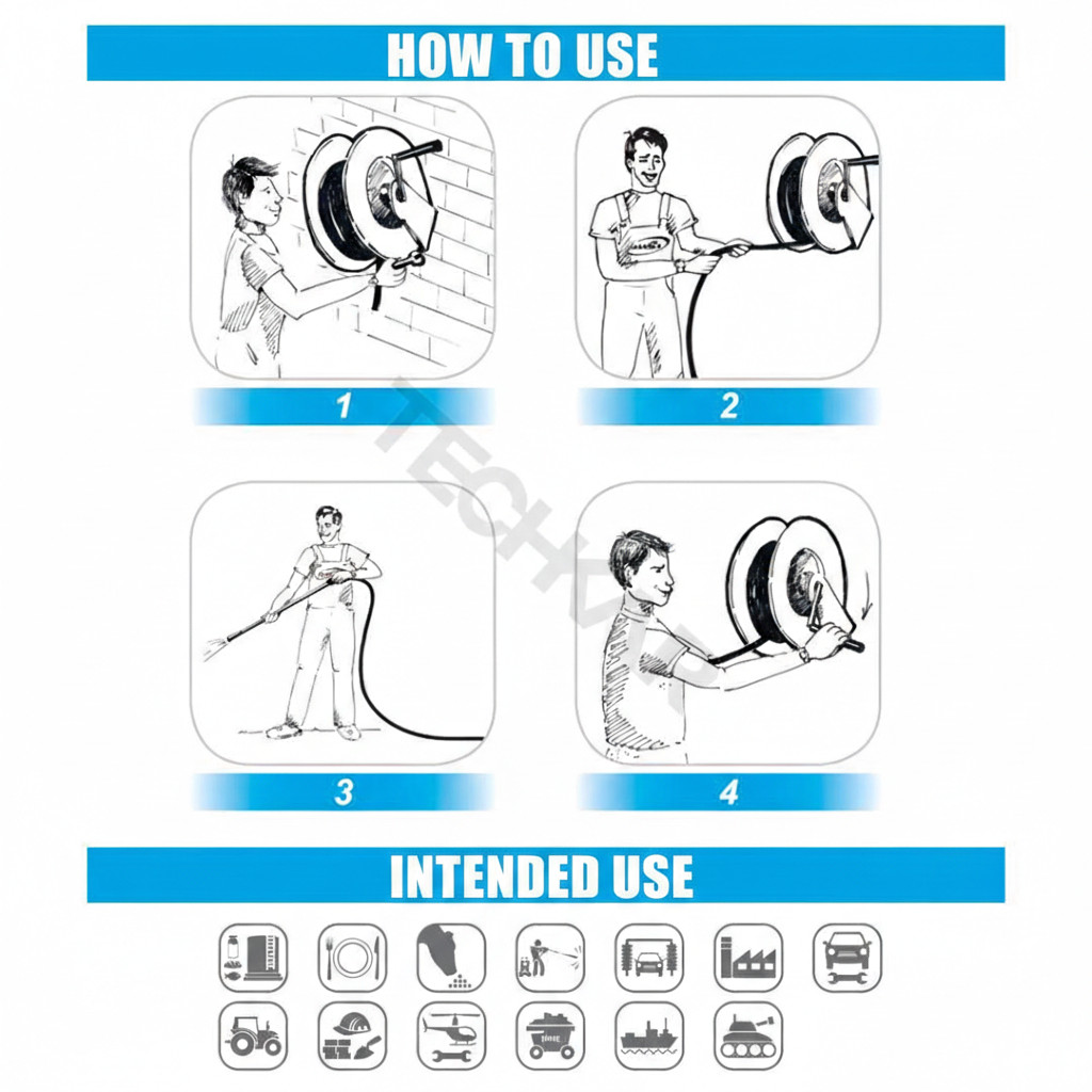 • Ergonómia: Könnyen kezelhető, kényelmes manuális hajtókar a tömlő gyors és rendezett feltekeréséhez.