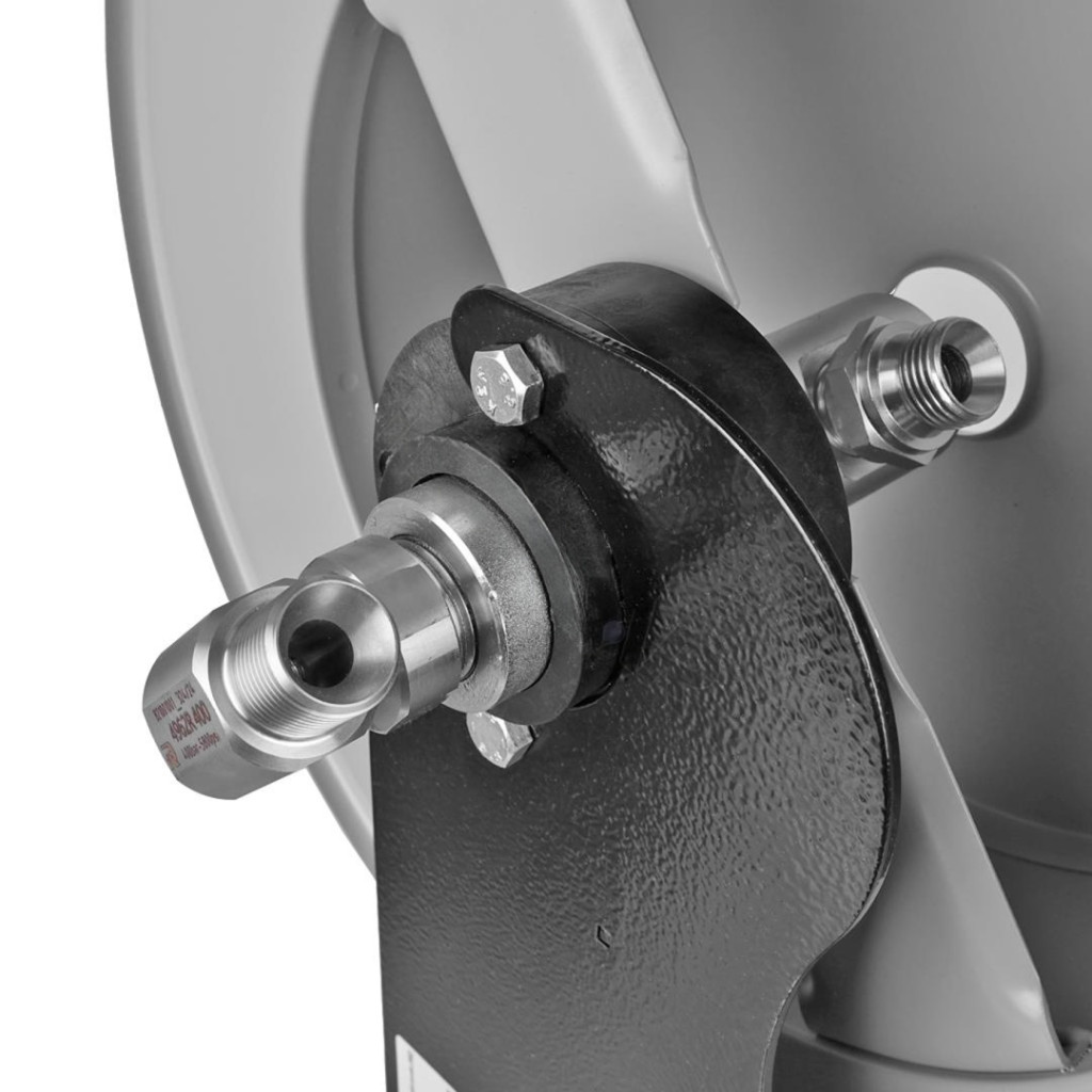 RAMEX Univerzális Ipari Magasnyomású Tömlődob – Professzionális, Olaszországban készült porszórt acél tömlőorsó, akár 80 méteres tömlőkapacitással. Extrém, 400 baros üzemi nyomásra és 140°C-os hőtűrésre tervezve. Falra, mennyezetre vagy járműre is szerelhető kivitel, kényelmes kézi hajtókarral. Tartós ipari megoldás, gördülékeny kiszolgálással.
