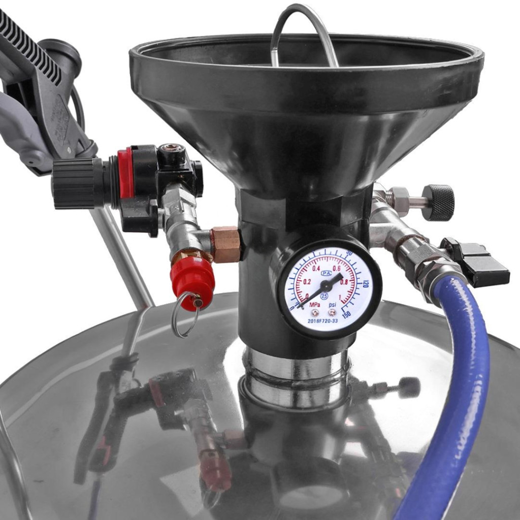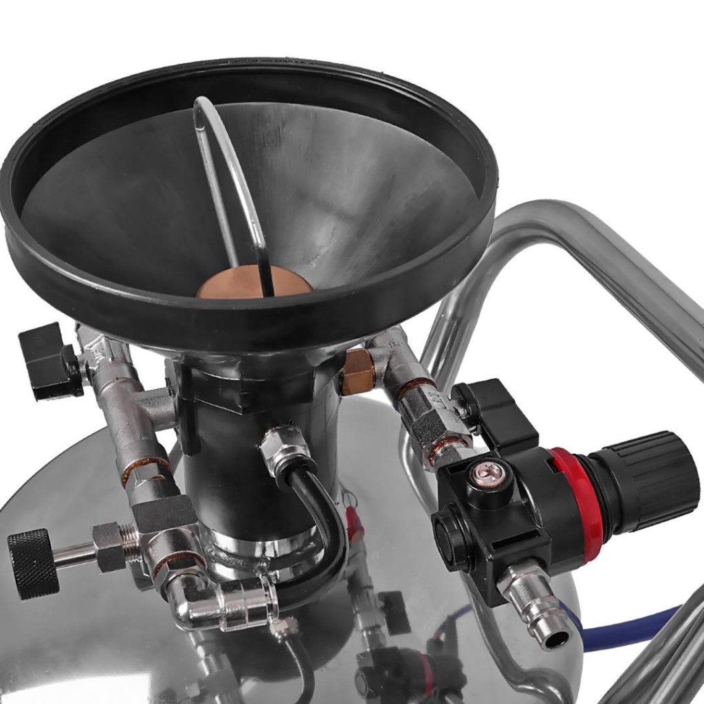 A tölcsér alakú töltőnyílás megkönnyíti a tartály feltöltését, a beépített nyomásmérő pedig lehetővé teszi a könnyű nyomásszabályozást és a készülék működésének optimális beállítását a kompresszorhoz.