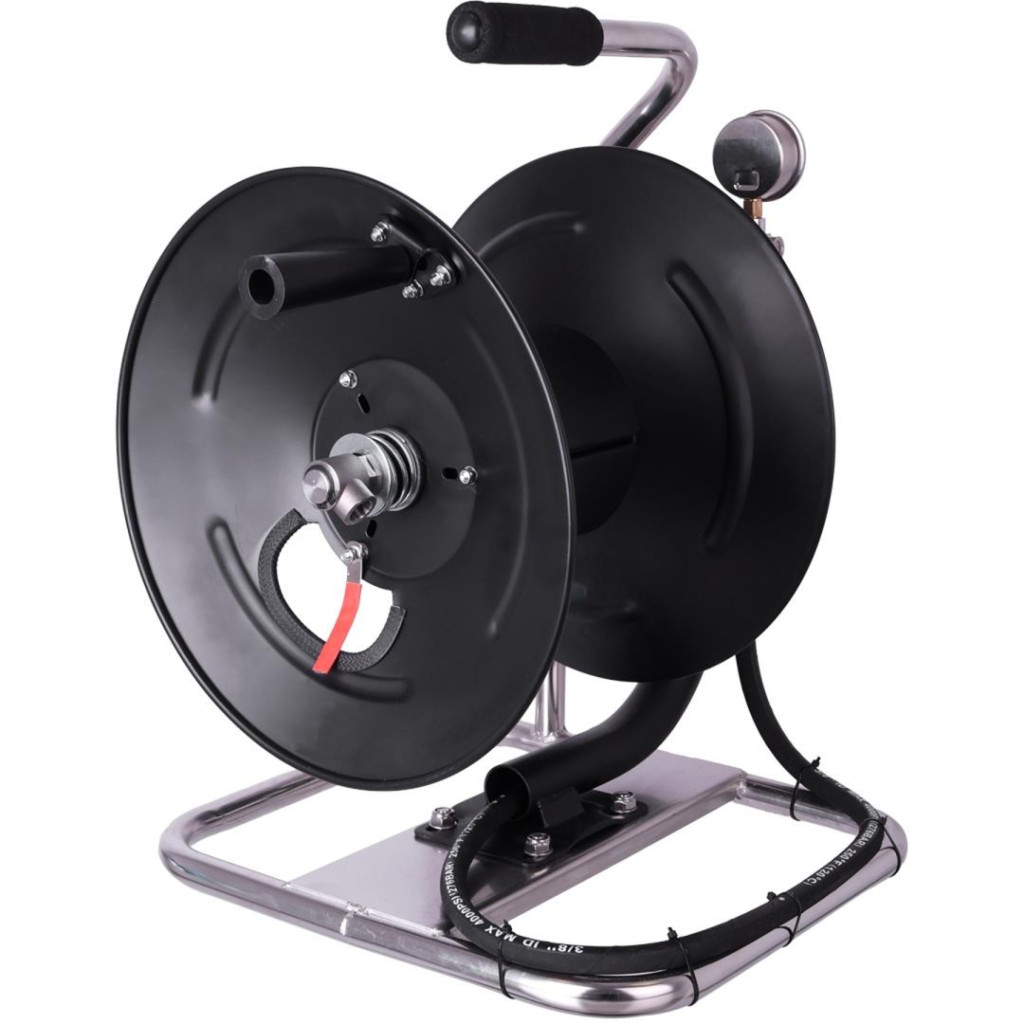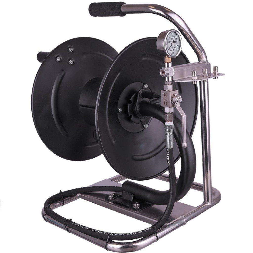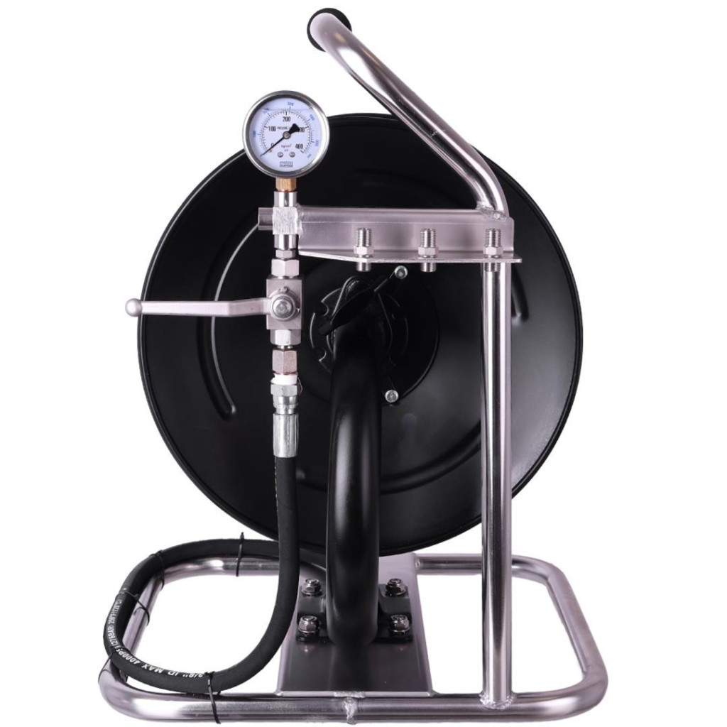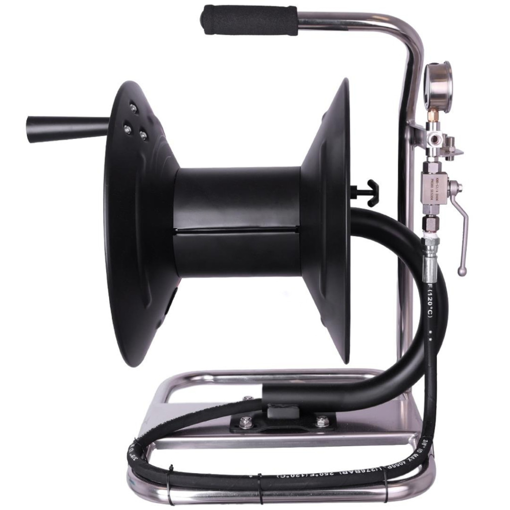 Szenyvíztömlő dob INOX állványon nyomásmérővel 1/4" és 3/8" menetes csatlakozással max. 60 méter magasnyomású tömlőhöz