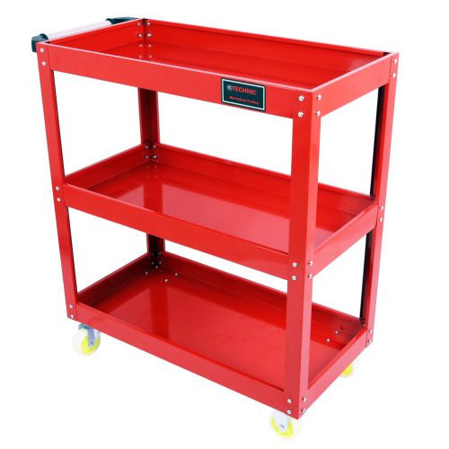 TC Technic 3 polcos műhelykocsi professzionális acél szerszámszállító eszköz műhelyekbe, szervizekbe és garázsokba. Stabil felépítése és magas peremű polcai biztonságos és rendezett szerszámtárolást tesznek lehetővé munka közben.