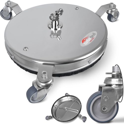 Amikor az olajfoltos ipari csarnokok, a vastagon szennyezett térkövek vagy a forró vizes tisztítást igénylő élelmiszeripari felületek takarításáról van szó, a hobbi eszközök percek alatt tönkremennek. A német R+M Suttner felkérte a svájci Mosmatic vállalatot – a világ legelismertebb forgócsukló- és felülettisztító-gyártóját –, hogy készítse el ezt a 16"-os (41 cm) TurboDevil modellt. Az eredmény egy teljesen rozsdamentes acélból (INOX) épített, elpusztíthatatlan munkaeszköz, amely rozsdamentes acél csapágyakat kapott, egy kézzel is könnyedén irányítható a falakon és a padlón egyaránt.