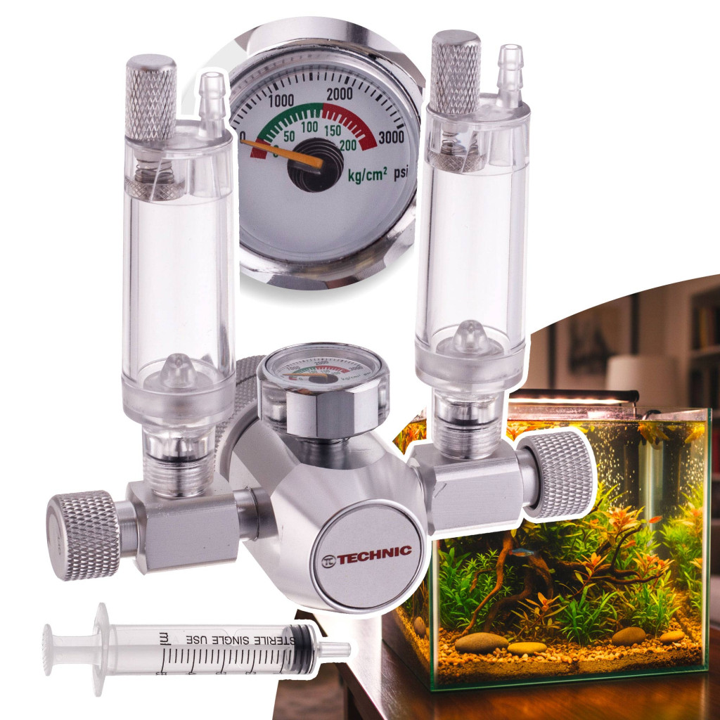 TC Technic CO2 reduktor növényes akváriumhoz buborékszámlálóval, manométerrel, két független kimenettel, W21,8 x 1/14” bemeneti menettel