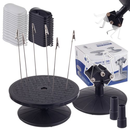 A forgatható alap lehetővé teszi, hogy a munkadarabot érintés nélkül, szabadon forgassa, ami növeli a pontosságot és a kényelmet festés közben. A platformon kialakított nyílásokba helyezhetők az acél klipszek, amelyek biztonságosan rögzítik a kisebb alkatrészeket. Az állítható alap a nagyobb elemek stabil befogására szolgál, szélessége könnyen a munkadarabhoz igazítható.
