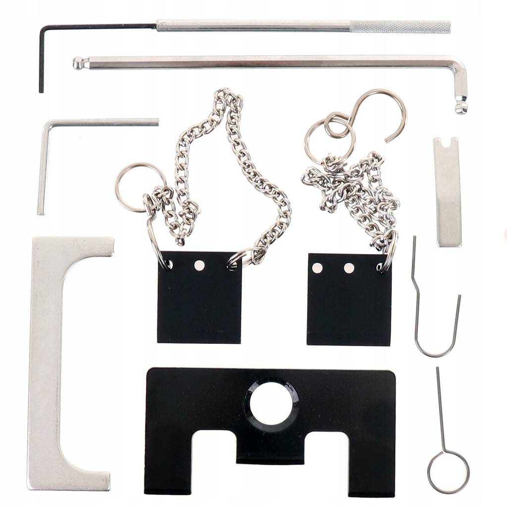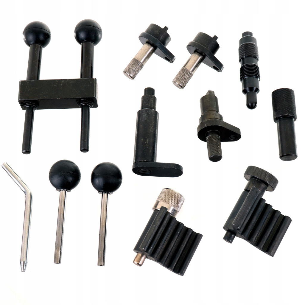 A készlet elemei között megtalálhatóak a speciális rögzítőtüskék, blokkolólemezek és feszítőgörgő-beállító kulcsok, amelyek elengedhetetlenek a vezérműszíj- vagy lánccsere során a motor fázisainak megtartásához.