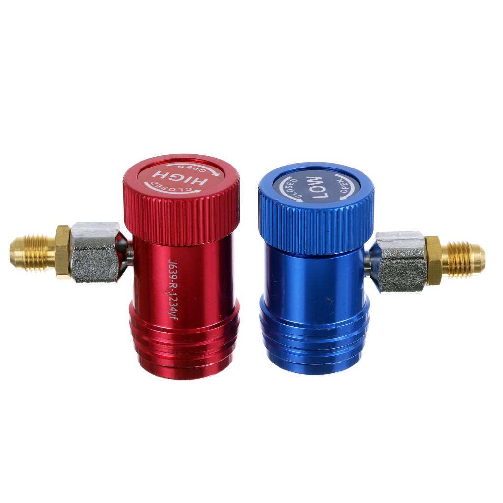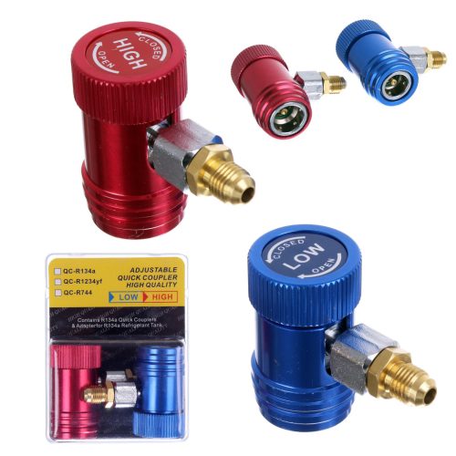 R1234YF klíma gyorscsatlakozó készlet (LOW + HIGH) professzionális autóklíma szervizeléshez és diagnosztikához tervezve. Biztonságos és szivárgásmentes csatlakozást tesz lehetővé a szerviztömlők és a klímarendszer között.