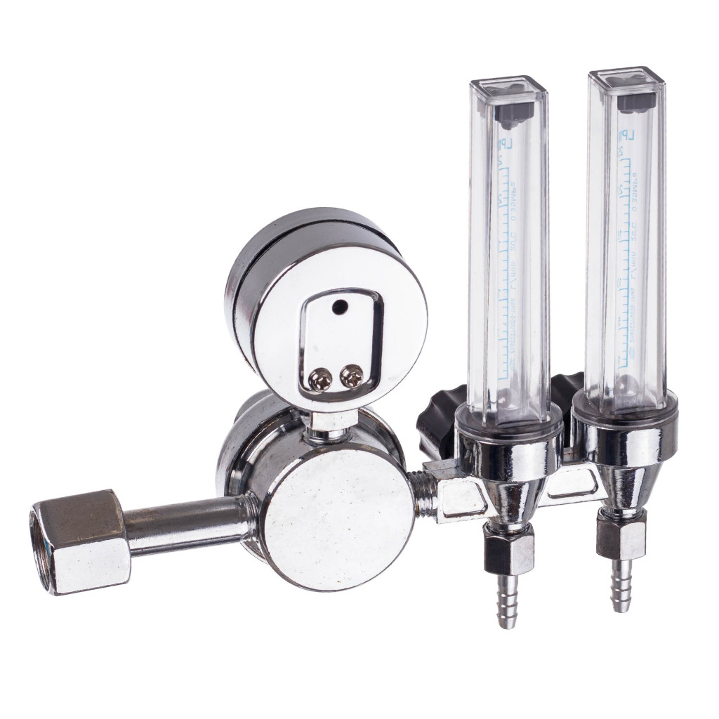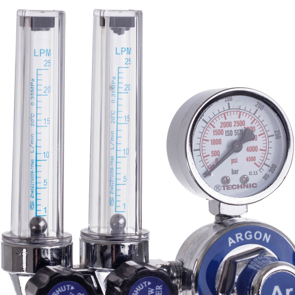 Argon / CO2 Nyomáscsökkentő Reduktor Hegesztési és akvarisztikai felhasználásra szánt nyomáscsökkentő, amely argon és szén-dioxid gázokhoz egyaránt használható. A két rotaméter lehetővé teszi a gázáramlás precíz, független szabályozását két kimeneten, ami különösen hasznos TIG csőhegesztésnél.