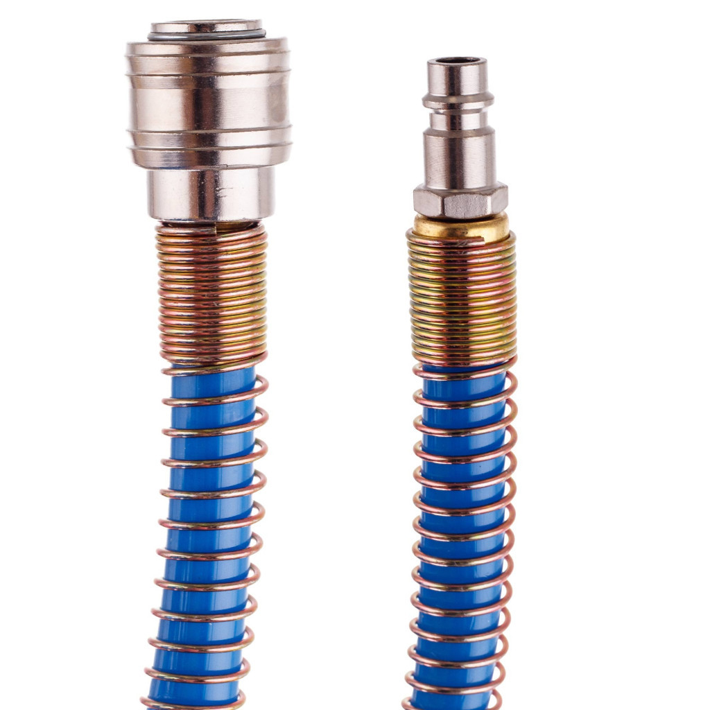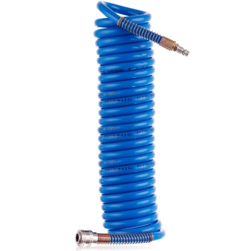 Ez a spiráltömlő sűrített levegő továbbítására szolgál pneumatikus szerszámok, kompresszorok és egyéb levegős berendezések között. Kiválóan alkalmas légkulcsokhoz, festékszórókhoz és tisztítópisztolyokhoz.
