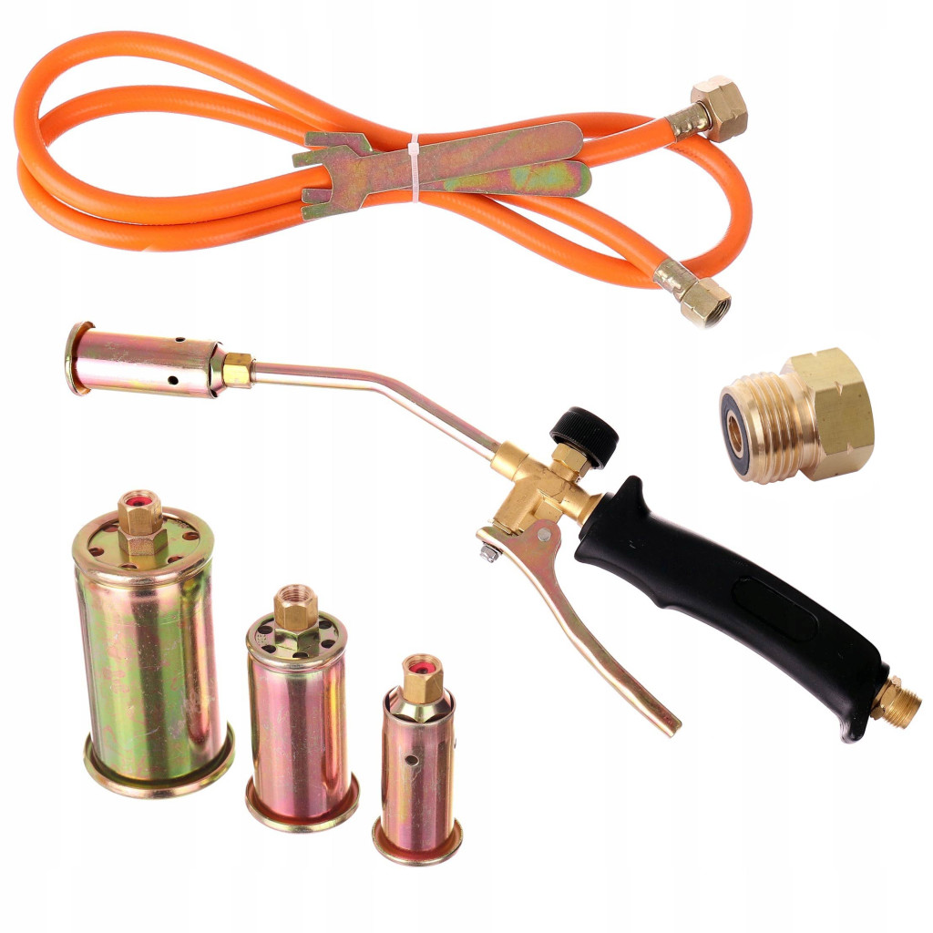 Rövid tetőfedő gázégő készlet 97 kW, 3 fúvóka (50/35/25 mm), 1,5 m tömlő, propán vagy propán-bután gázhoz, 1850 °C max. lánghőmérséklet, csatlakozás 11 kg-os palackhoz és turistapalackhoz