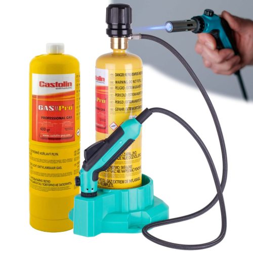 Professzionális gázüzemű precíziós forrasztóállomás, max. 1300°C lánghőmérséklettel, 1 m integrált gázcsővel, piezo gyújtással, szabványos MAPP 1"-20 UNEF (CGA-600) gázpalack csatlakozással, 2 db CASTOLIN MAPP/propán–propilén gázpalackkal