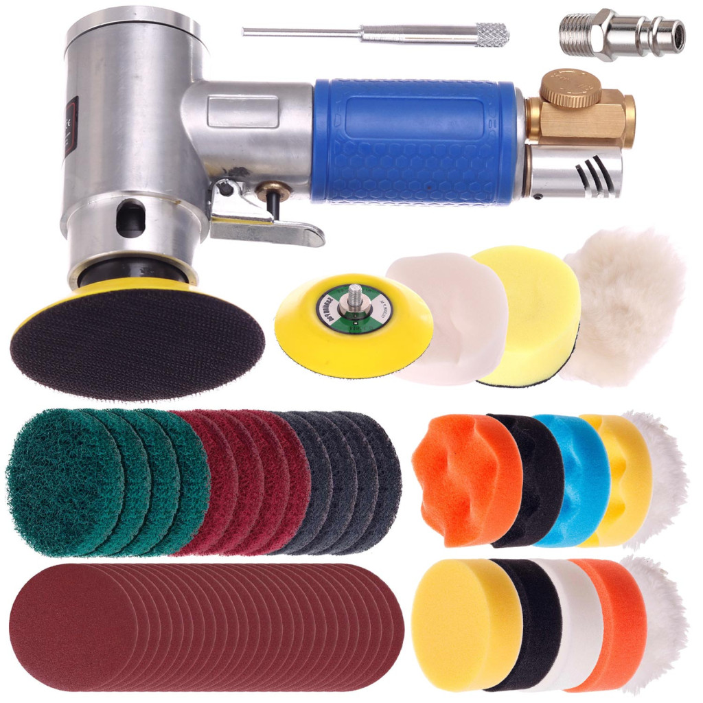 TELJES KÉSZLET: Pneumatikus excenteres polírozó AT-8018; 75 mm tárcsa; 51 részes szivacs, filc, vlies és csiszolólap tartozékkal a teljes munkafolyamathoz