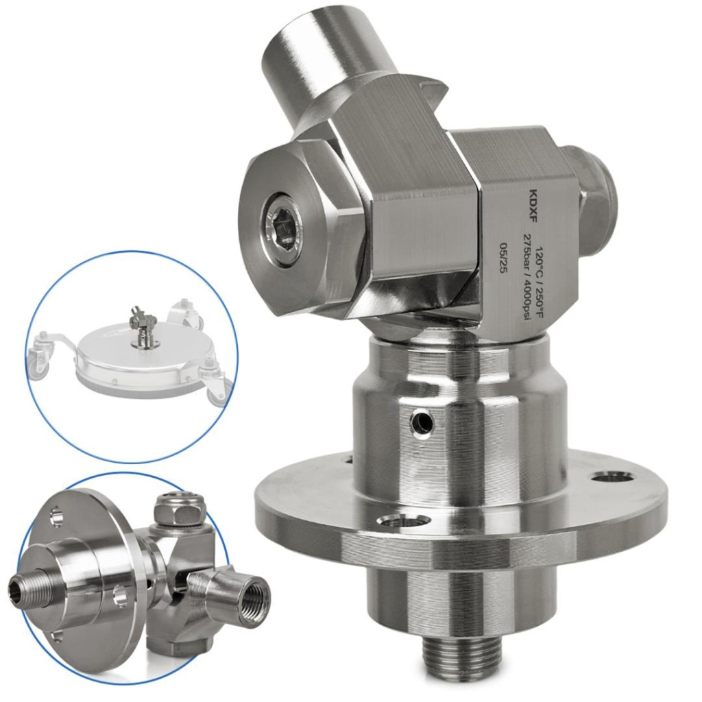 Az eredeti, komplett forgócsuklós csatlakozó kifejezetten a T-racer TurboDevil TD-300 (12") IPARI rozsdamentes (INOX) kefékhez készült, a német R+M gyártótól. A csatlakozó magasnyomású ipari tisztításhoz lett tervezve, akár 275 bar üzemi nyomásig és 120°C hőmérsékletig, biztosítva a kefefej egyenletes, megbízható forgását.