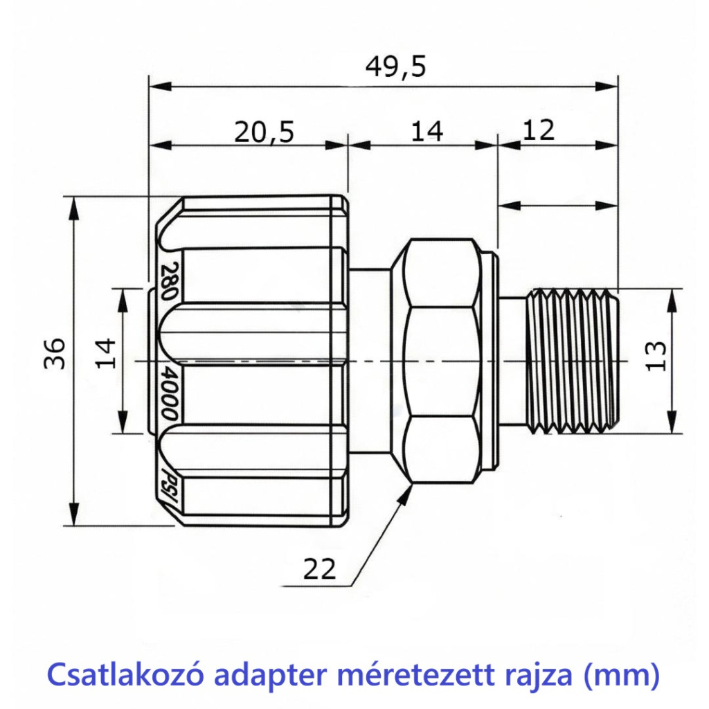 • Fontos csatlakozási infó: Az adapter egyik fele egy M22x1,5 mm-es belső menet (14 mm-es belső tömítő csappal), míg a másik fele egy szabványos 1/4 colos külső menet. Kérjük, rendelés előtt ellenőrizze a csatlakoztatni kívánt pisztoly és tartozék méreteit!