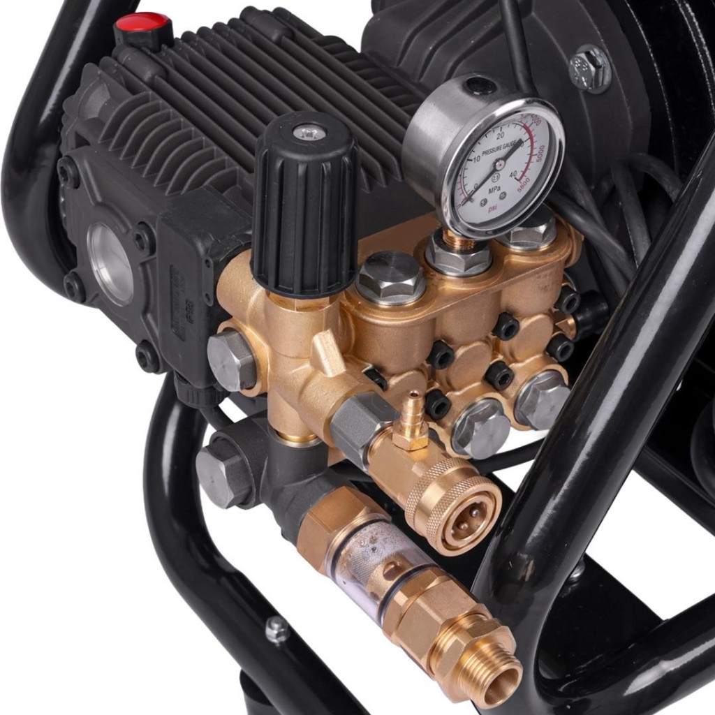 A kínálatunk legerősebb elektromos gépe: 250 bar nyomás és 15,5 liter/perc vízhozam kombinációja. Ezt a 3 fázisú (400V) berendezést egy robusztus, 7,5 kW teljesítményű, lassú járású (1450 ford./perc) villanymotor hajtja. A hajtókaros, sárgaréz hengerfejjel és kerámia dugattyúkkal szerelt szivattyú folyamatos ipari igénybevételre készült. Ideális választás oda, ahol a 200 bar már kevés: nehézgép-mosáshoz, betonfelületek tisztításához és állattartó telepekre. Karcher kompatibilis M22-es csatlakozásokkal. Gyors kiszolgálással.