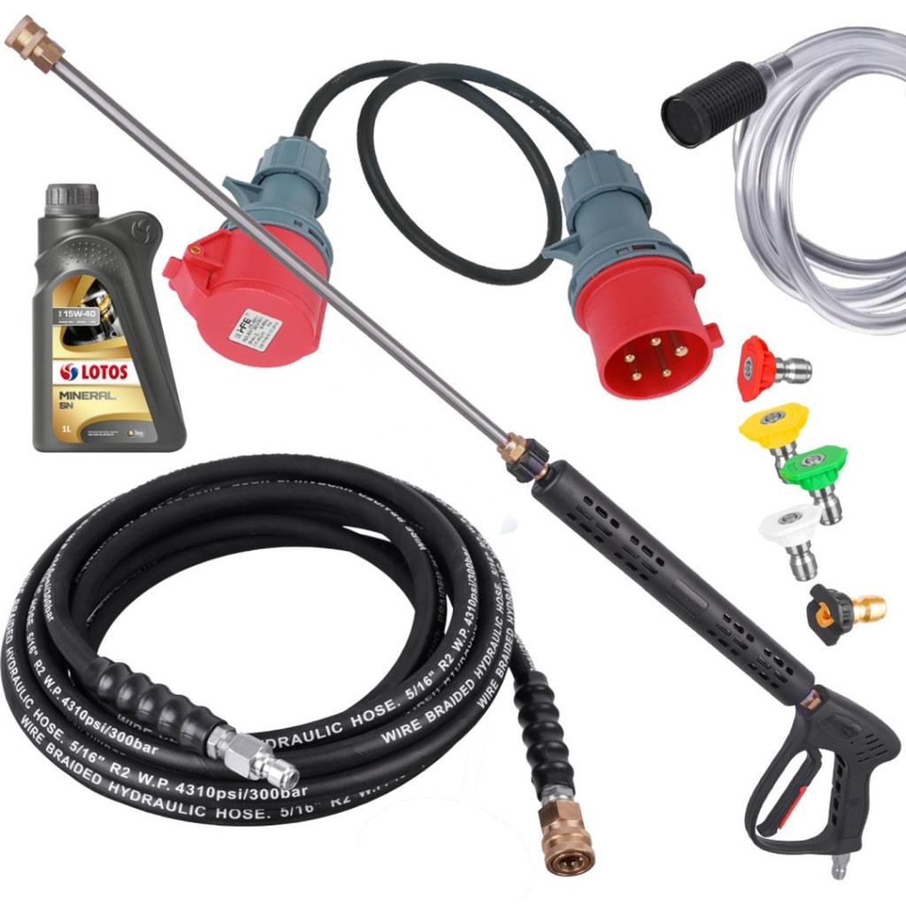 • Kimenet és Tömlő: M22x1,5 csatlakozás (Standard Karcher menet). A csomag tartalmaz 10 méter duplán erősített (2SN), 400 barig terhelhető ipari tömlőt.