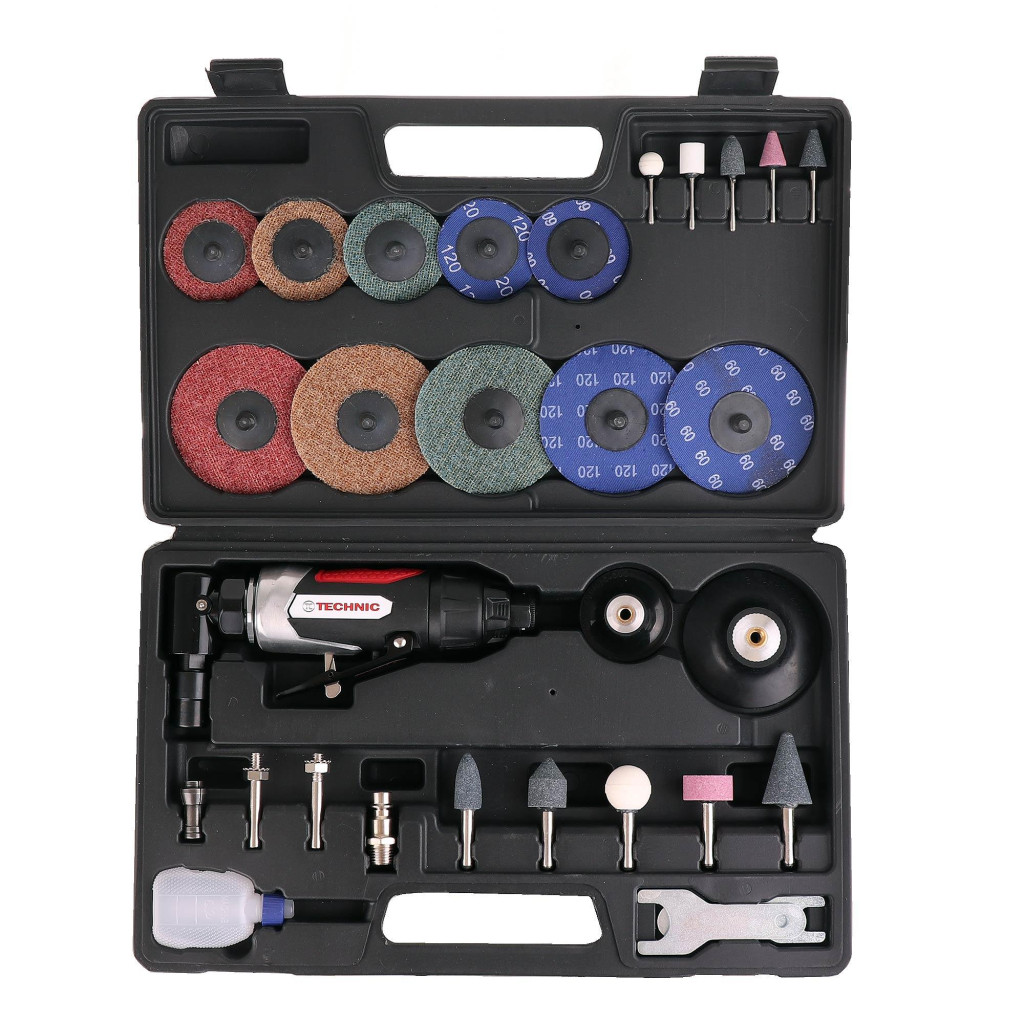 Pneumatikus sarokcsiszoló készlet korongokkal és csíszoló kövekkel kofferben TC Technic AT-7034FMK 6 és 3 mm-es befogatással