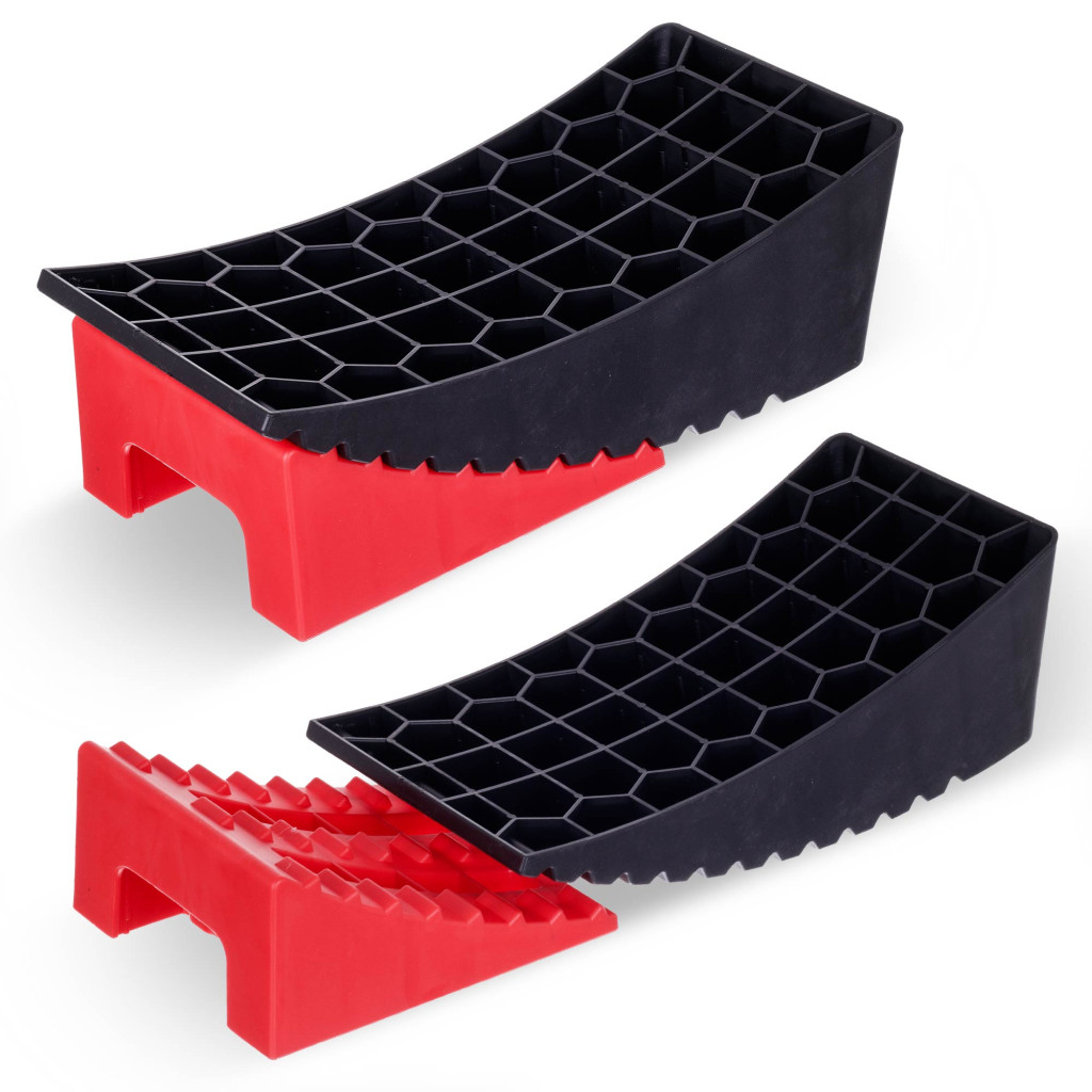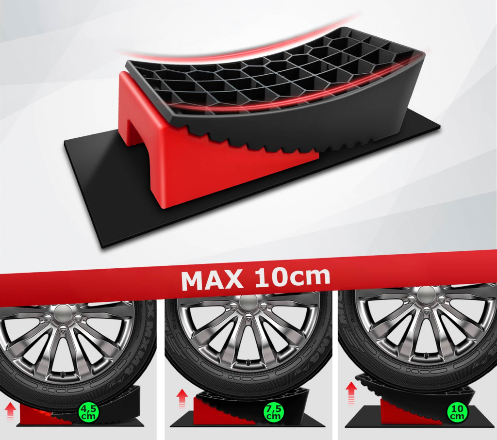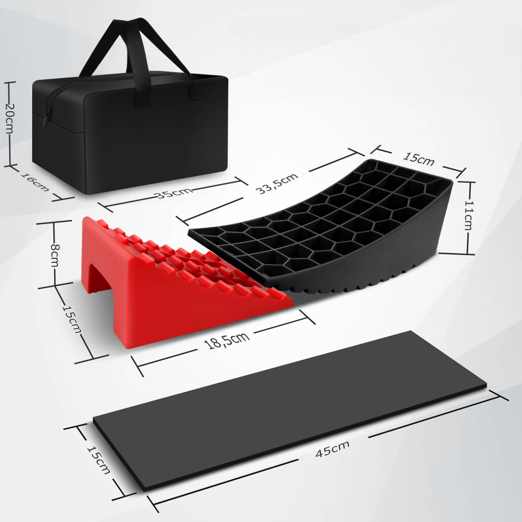 • Komplex csúszásgátló rendszer: a készlet nemcsak a rámpákat tartalmazza! A kerék visszagurulását a piros rögzítőékek akadályozzák meg, a rámpa elcsúszását pedig a kerekek alá helyezhető speciális gumiszőnyegek gátolják.