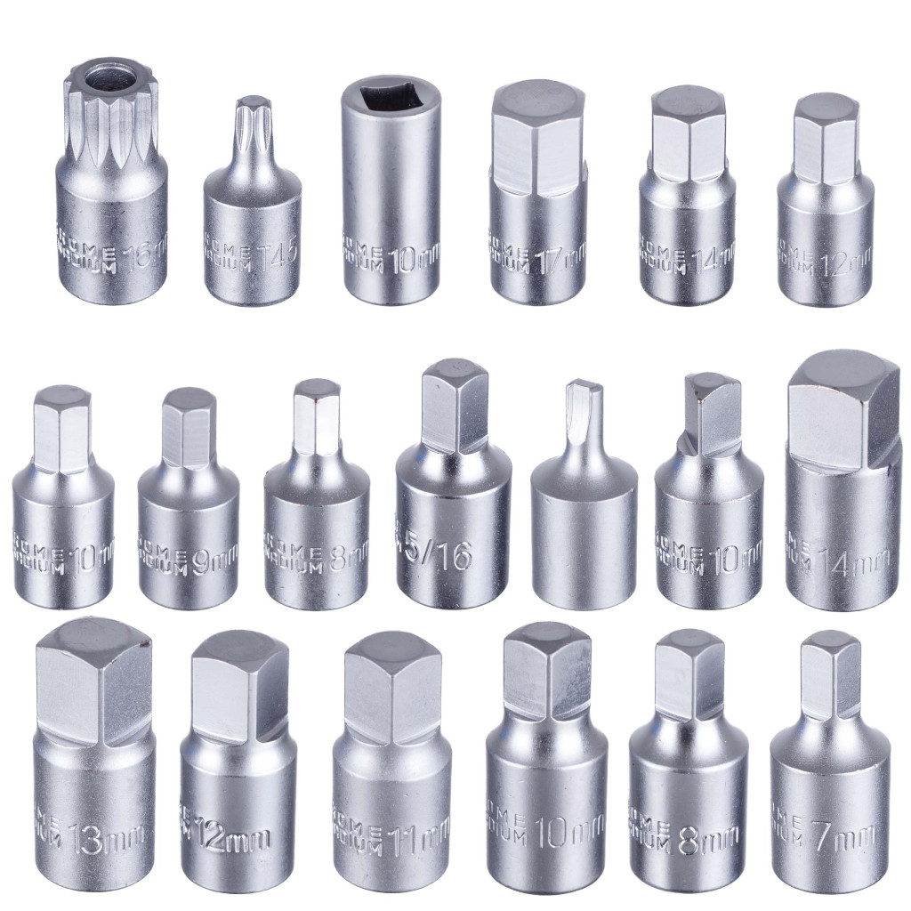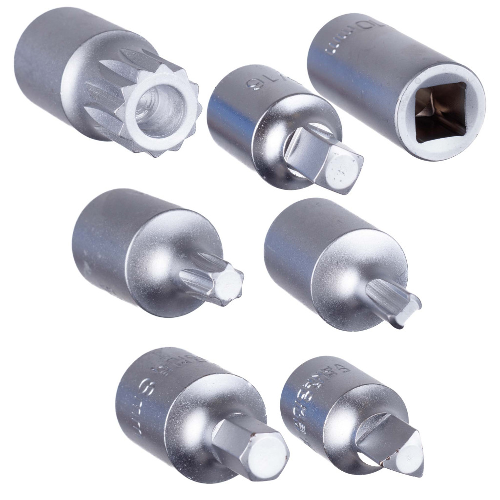 • Széles profilválaszték: a készlet belső és külső négyszög, imbusz (hatszög), háromszög, bordás és Torx (T45) profilokat is tartalmaz a legnépszerűbb méretekben.