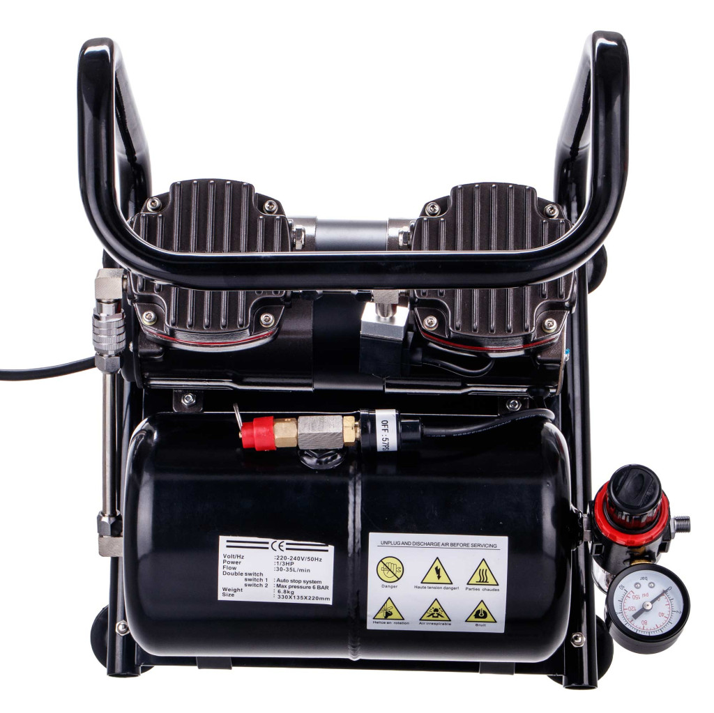 Kétdugattyús, 6 bar-os, 3 literes tartályos, 250W teljesítményű Airbrush kompresszor reduktorral és szűrővel