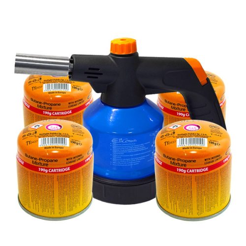 LUTLÁMPA GÁZOS FORRASZTÓLAMPA PIEZO GYÚJTÓVAL ÉS 4 DB 190G GÁZKARTUSZ