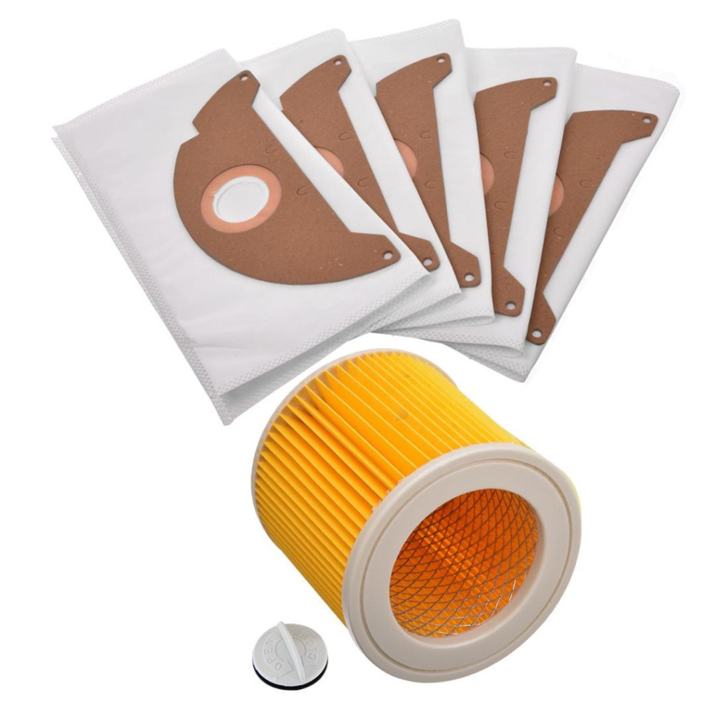 Porzsák és szűrő szett Karcher A2000/WD2 sorozathoz (5+1 db). Ez a gazdaságos csomag biztosítja a kompatibilis Karcher porszívók hatékony működését és szűrési teljesítményét, a szintetikus porzsákoknak és a megerősített szűrőnek köszönhetően.