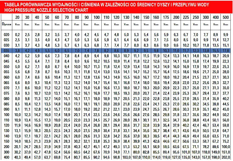 Ez a méret tökéletes az olyan felső-középkategóriás otthoni és kisebb benzinmotoros gépekhez, amelyek üzemi nyomása 110 és 150 bar között van, a vízszállításuk pedig 420 - 500 liter/óra (kb. 7 - 8,5 liter/perc) közötti. Ha ezt a 035-ös fúvókát egy túl kicsi (pl. Kärcher K2) gépre teszi rá, a nyomás érezhetően le fog esni. Túl nagy (pl. 800 l/h) gép esetén pedig a gép folyamatosan lekapcsolhat a túlnyomás miatt.