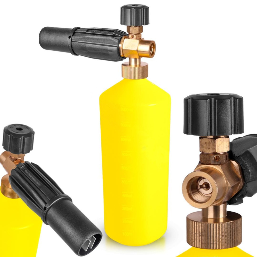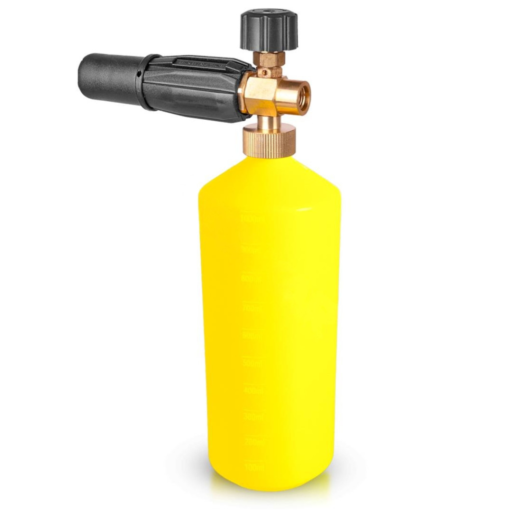 Sárgaréz habosító (sárga, 1,25 mm / 1/4"): a tökéletes érintésmentes mosás alapja, feltűnő sárga kivitelben. Készítsen profi, vastag hóhabot a saját garázsában vagy műhelyében! A robusztus sárgaréz test gondoskodik a tartósságról, az 1,25 mm-es fúvóka pedig garantálja, hogy a 400-600 l/h vízhozamú gépével sűrű, hatékony habot tudjon felvinni a járművekre. Védje meg gépe szivattyúját a maró vegyszerektől egy külső habosító lándzsa használatával!