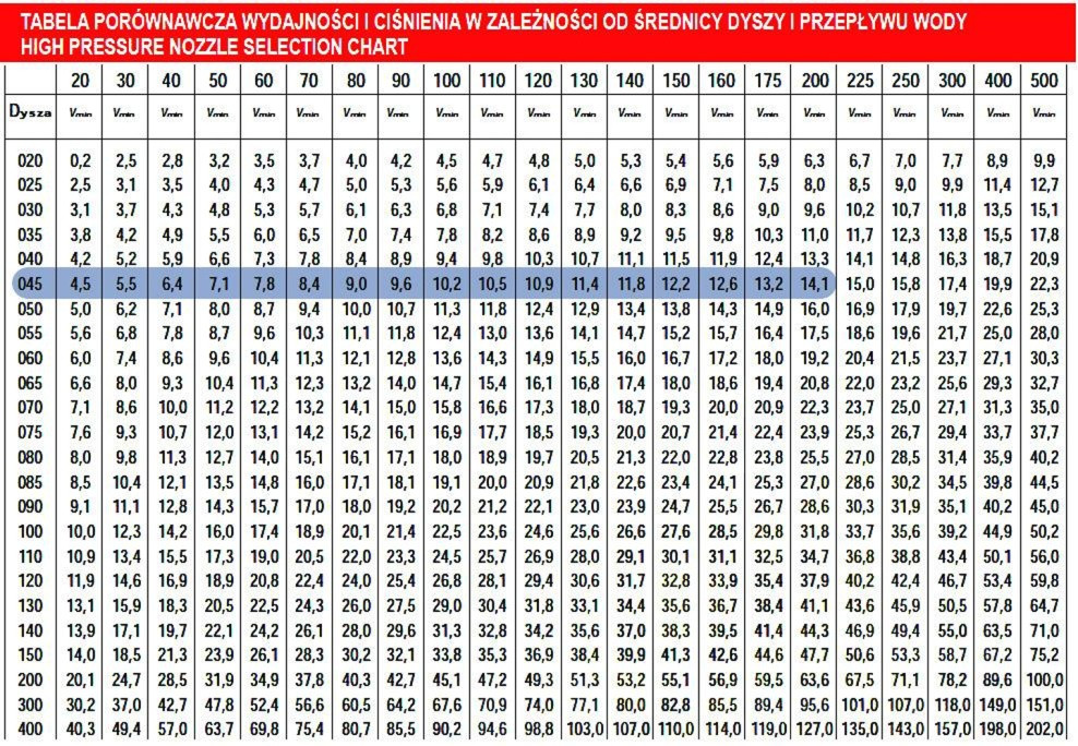 Ez a készlet 045-ös méretű vízfúvókával van szerelve, amely ideális a professzionális közép- és felsőkategóriás gépekhez (amelyek vízszállítása kb. 11-13 liter/perc, azaz 660-780 liter/óra). A fej szabványos 1/4" (kb. 12,9 mm) külső menettel csatlakozik.