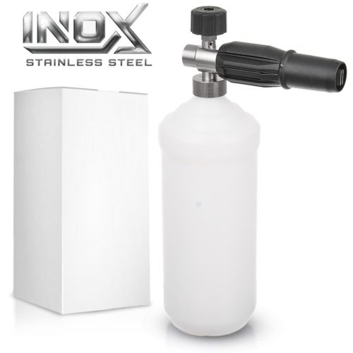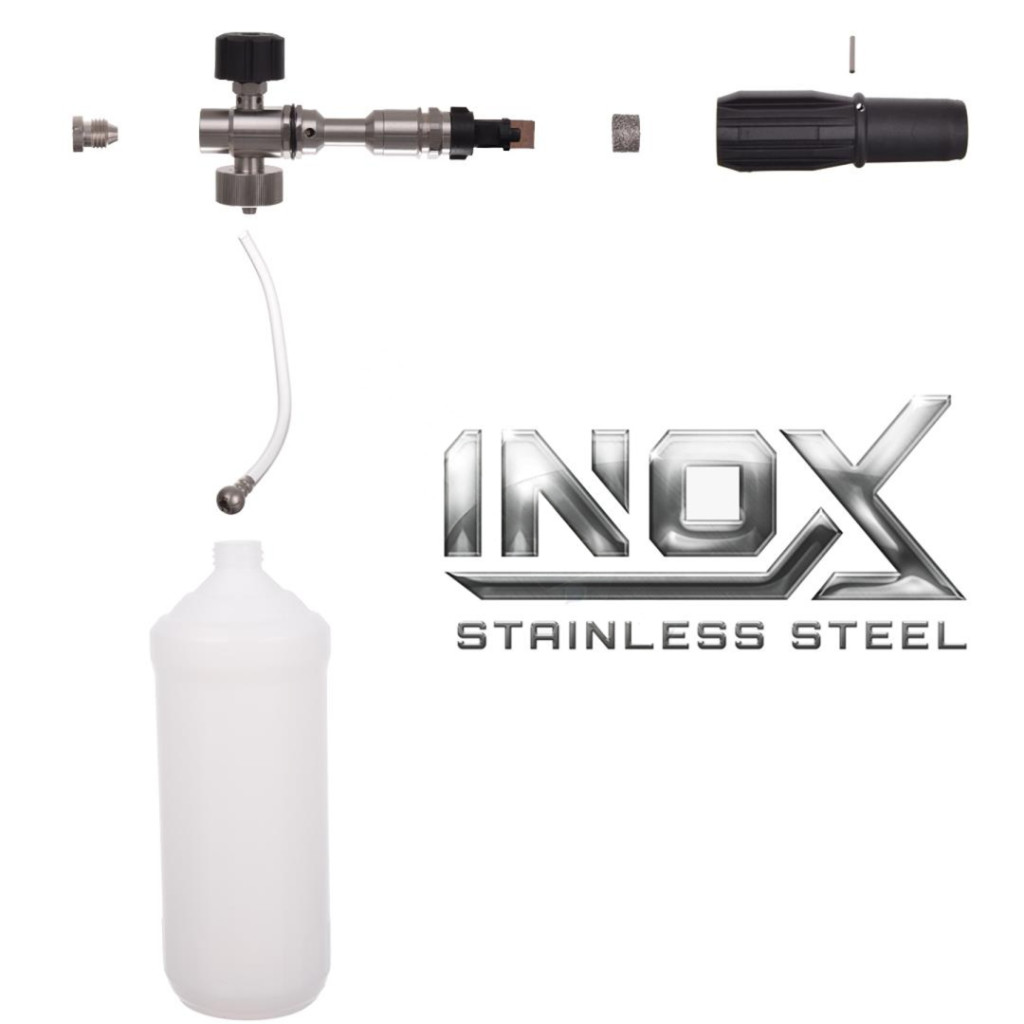 Az érintésmentes autómosás alapja a sűrű, borotvahab-szerű aktív hab, amely lassan folyik le a karosszériáról, így elegendő ideje van feloldani a rászáradt sarat és bogarakat. Ezt a minőséget a mosógépek beépített vegyszeradagolói nem tudják produkálni. Ez a prémium INOX habosító a nagynyomású vizet, a levegőt és a vegyszert egy speciális fémhálón (habtablettán) préseli át, így hozva létre a tökéletes, sűrű habréteget. A tetején található tekerőgombbal hajszálpontosan beállíthatja a vegyszer keverési arányát, míg az elülső terelőlapátokkal a szóráskép szögét (széles legyezőtől a keskeny sugárig) szabályozhatja.