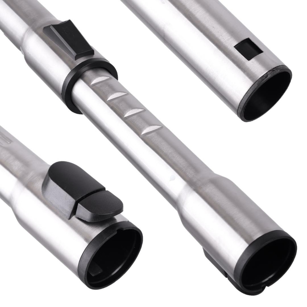 A krómozott acélból készült cső ellenáll a mindennapi használatnak. Alsó végén a jellegzetes négyszögletes kivágás található, amelybe a Miele padlófejek rögzítőgombja biztonságosan bepattan, megakadályozva a fej leesését porszívózás közben.