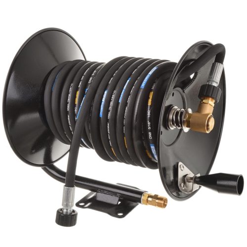 • Robusztus fémház és biztonság: a tartós porszórt acél keret ellenáll a rozsdának, a beépített reteszelő mechanizmus pedig megakadályozza a masszív, 60 méteres tömlő véletlen letekeredését munka közben.
