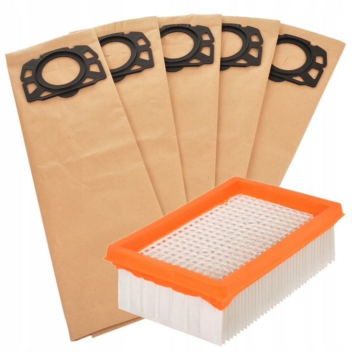 Papír porzsák és szűrő csomag Karcher WD4 WD5 WD6 MV4 MV5 MV6 porszívókhoz (2.863-006.0 cikkszám kiváltására) 1 szűrő, 5 porzsák